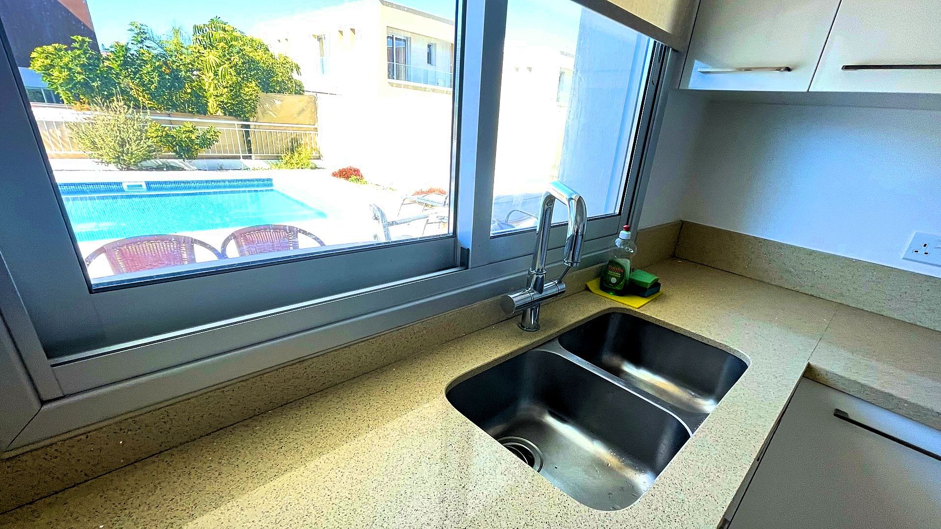 Willa Bajeczny Cypr posiada prywatny basen do użytku Gości w willi. Basen jest o wymiarach 4 m x 12 m, i głębokości stopniowanej, od 90 cm do 170 cm. Wokół basenu jest nowoczesny taras, 1 zejście do basenu. Basen posiada prywatną pompę do filtrowania w trybie automatycznym i ciągłym, a także nocne oświetlenie umożliwiające korzystania z basenu przez 24 h na dobę. Basen jest systtematycznie chlorowany i wówczas przez okres czyszczenia basenu nie można z niego korzystać, zwykle w nocy. Basen prywatny w tym klimacie, w szczególności latem jest koniecznością. Wiekszość willi w Pafos nie posiada prywatnego baseny tylko miejski lub społeczny, co wiąże się z trudnościami w korzystaniu i czystością takich basenów. A więc proponujemy zawsze wybierać prwatny basen do dyspozycji Gości willi.